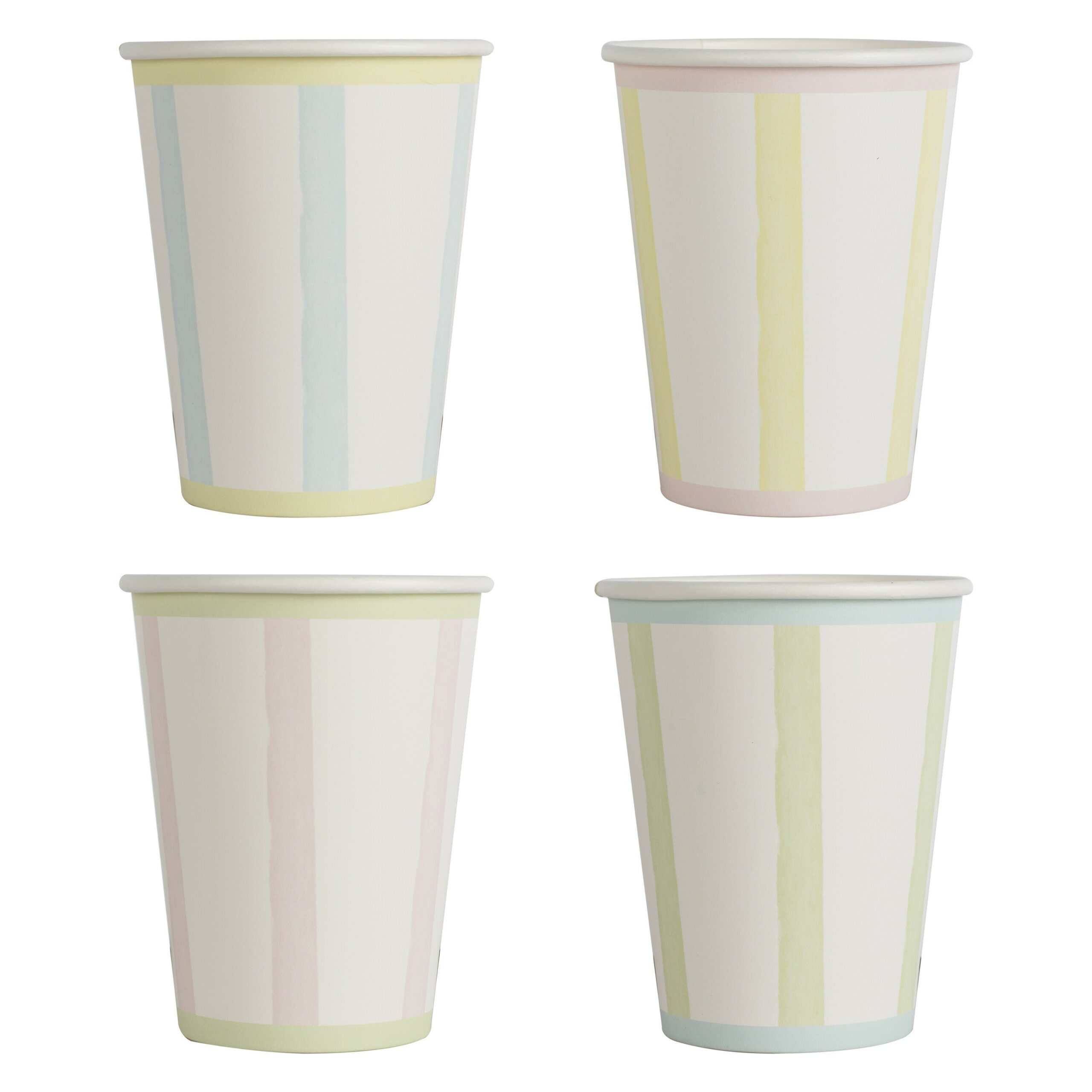 Pack de 8 vasos con rayas en tonos pastel. Miden 11cm de alto