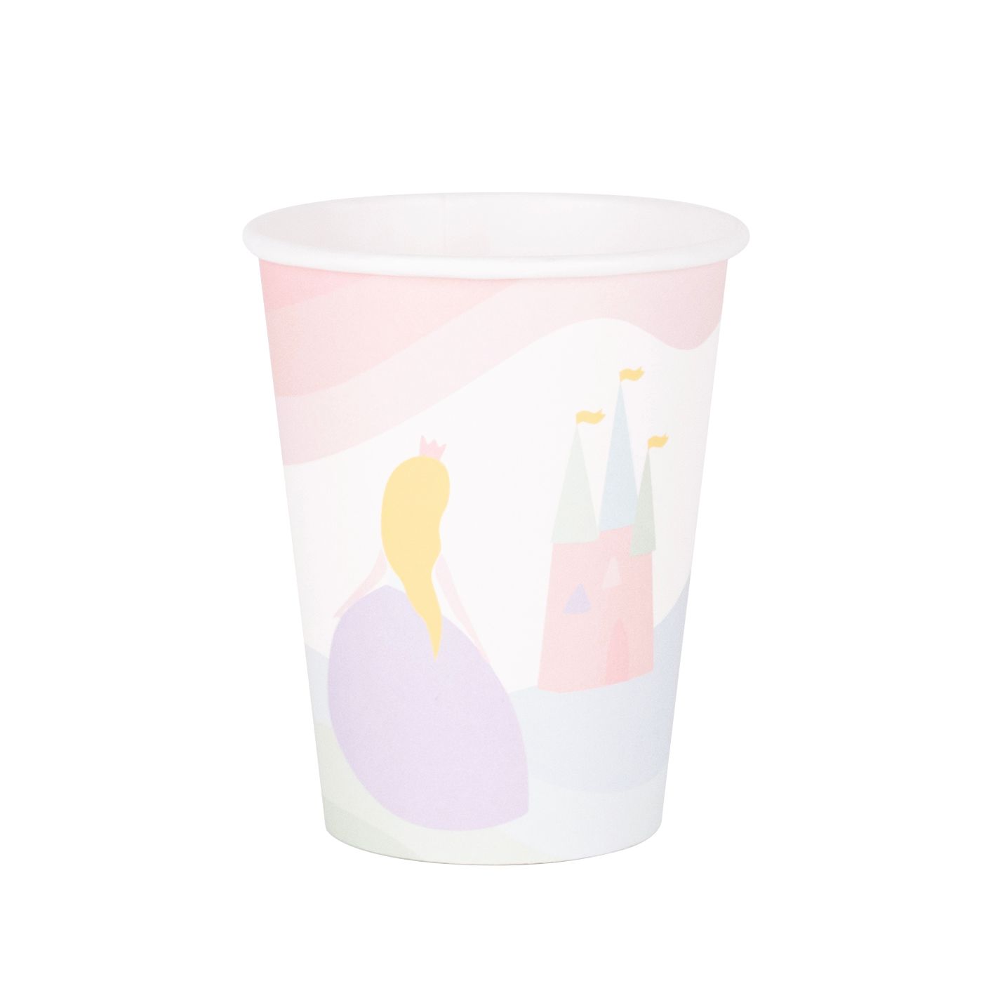 Pack de 8 vasos de cartón con estampado en tonos pastel de una princesa y su castillo, miden 9,5cm y 8cm de diametro.