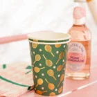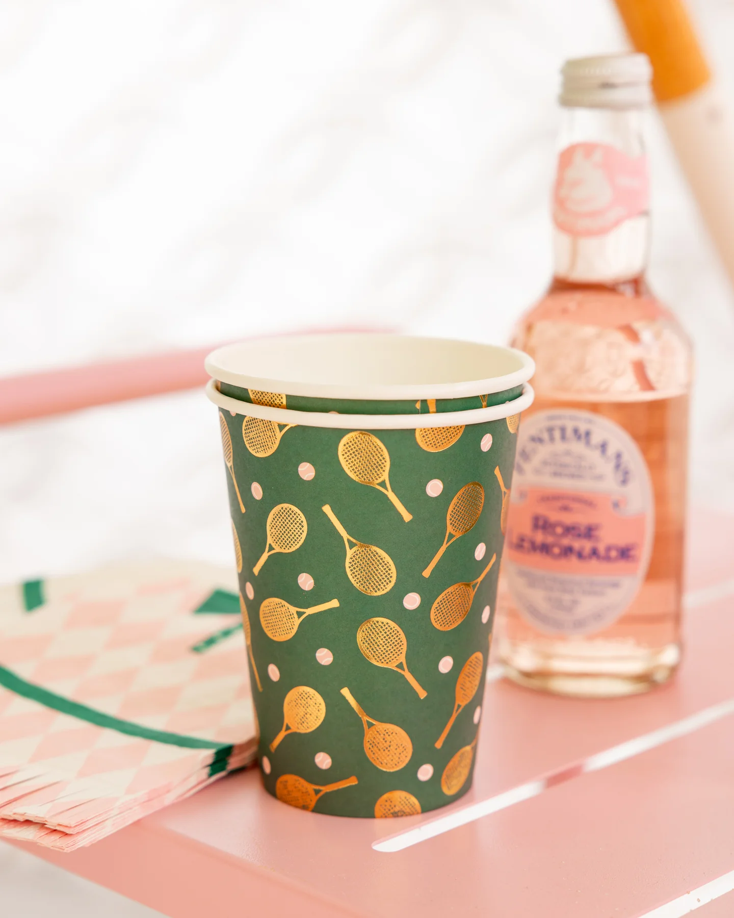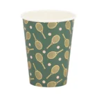 Pack de 8 vasos de papel en color verde con detalles de raqueta y pelotas. Capacidad de 350 ml