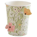 Pack de 8 vasos verdes con diseño floral. Algunas flores están siluetadas alrededor del vaso