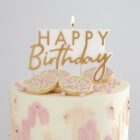Bonita vela blanca con texto en dorado Happy Birthday, mide 6x12cm y lleva unos palitos para pincharla en la tarta.